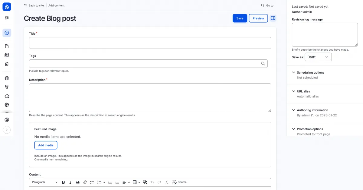 Ein Blog Post hat dann einen Titel, Tags, Beschreibung (die neue Summary), Featured Bild und den WYSIWYG unterstützen Inhalt. Scheduler ist out-of-the-box unterstützt.